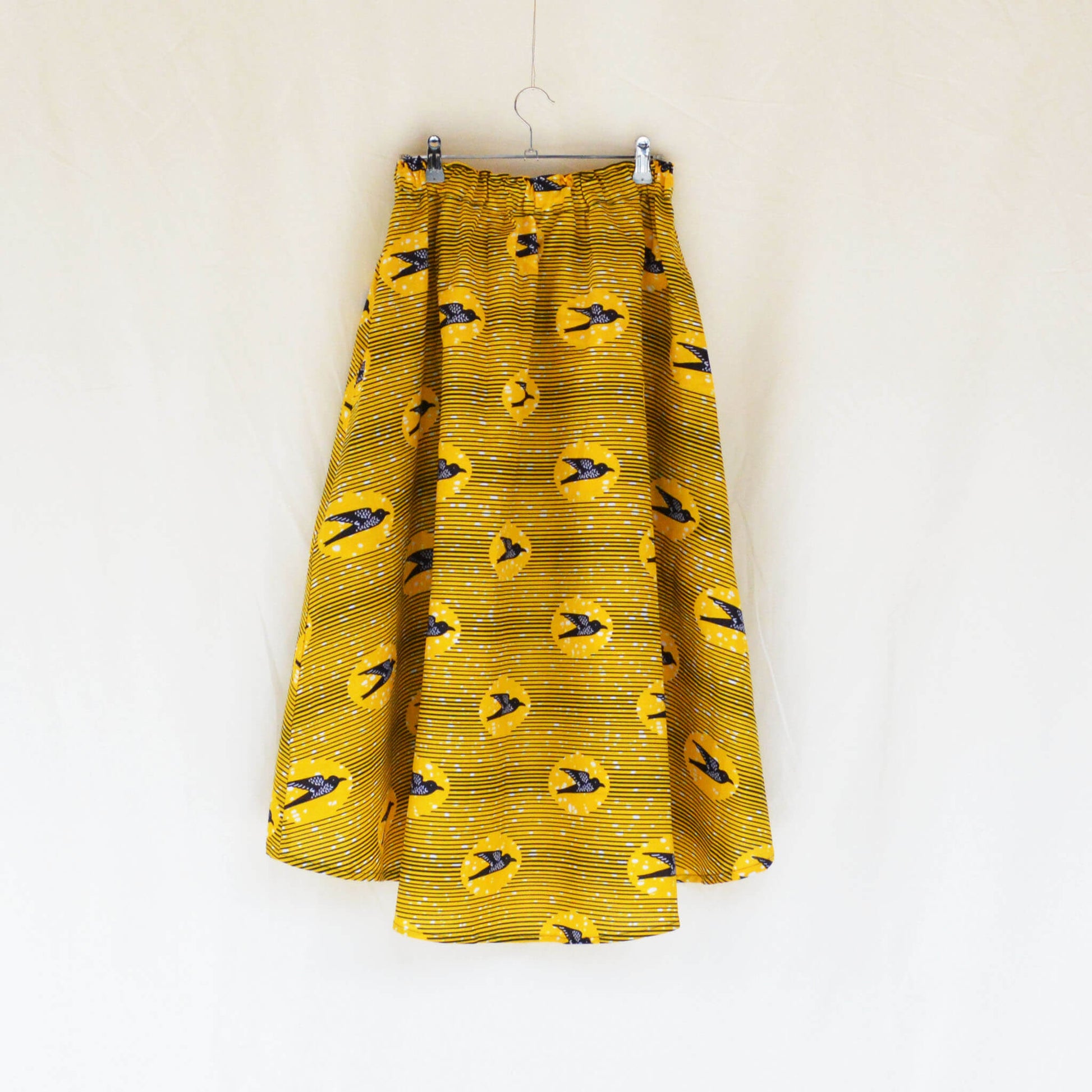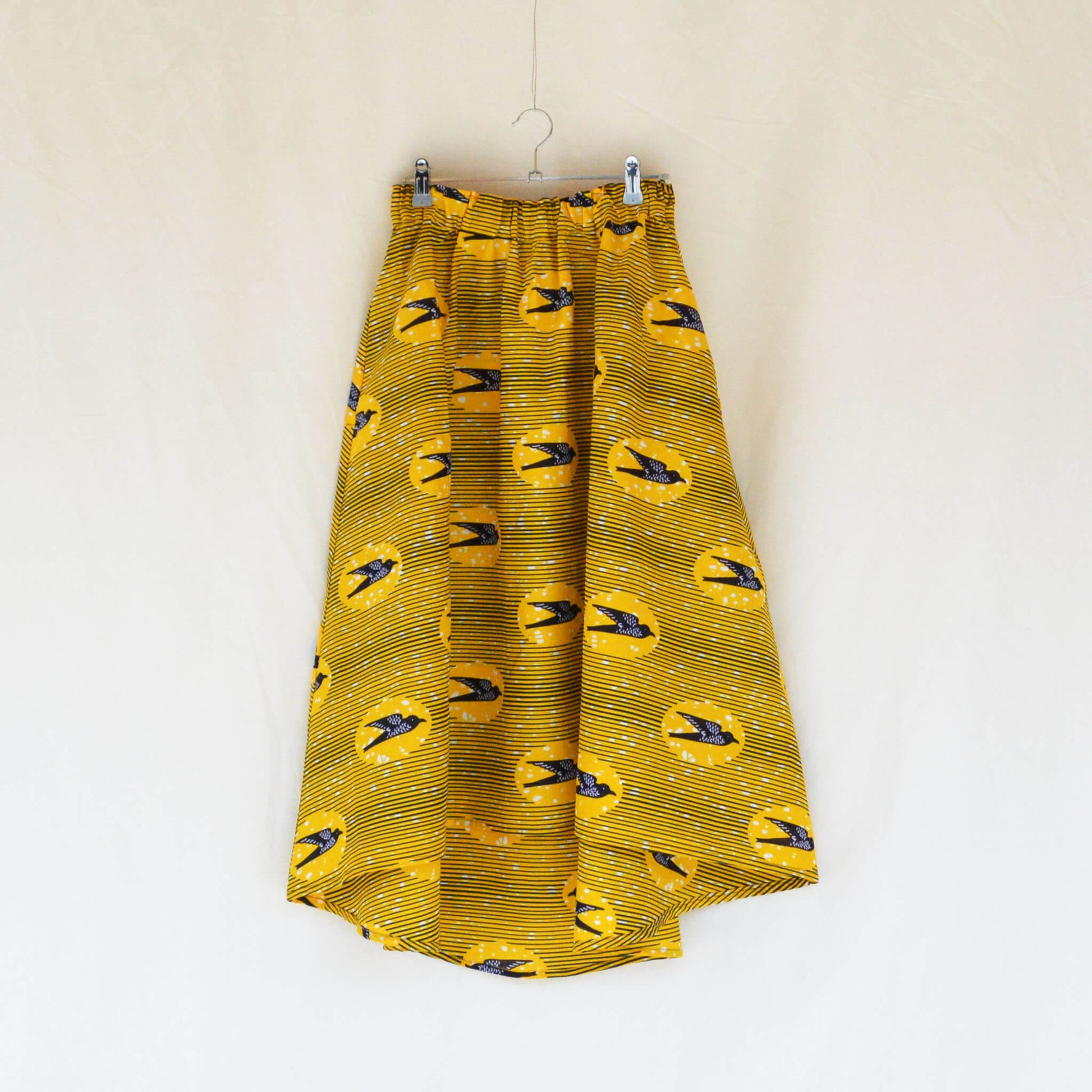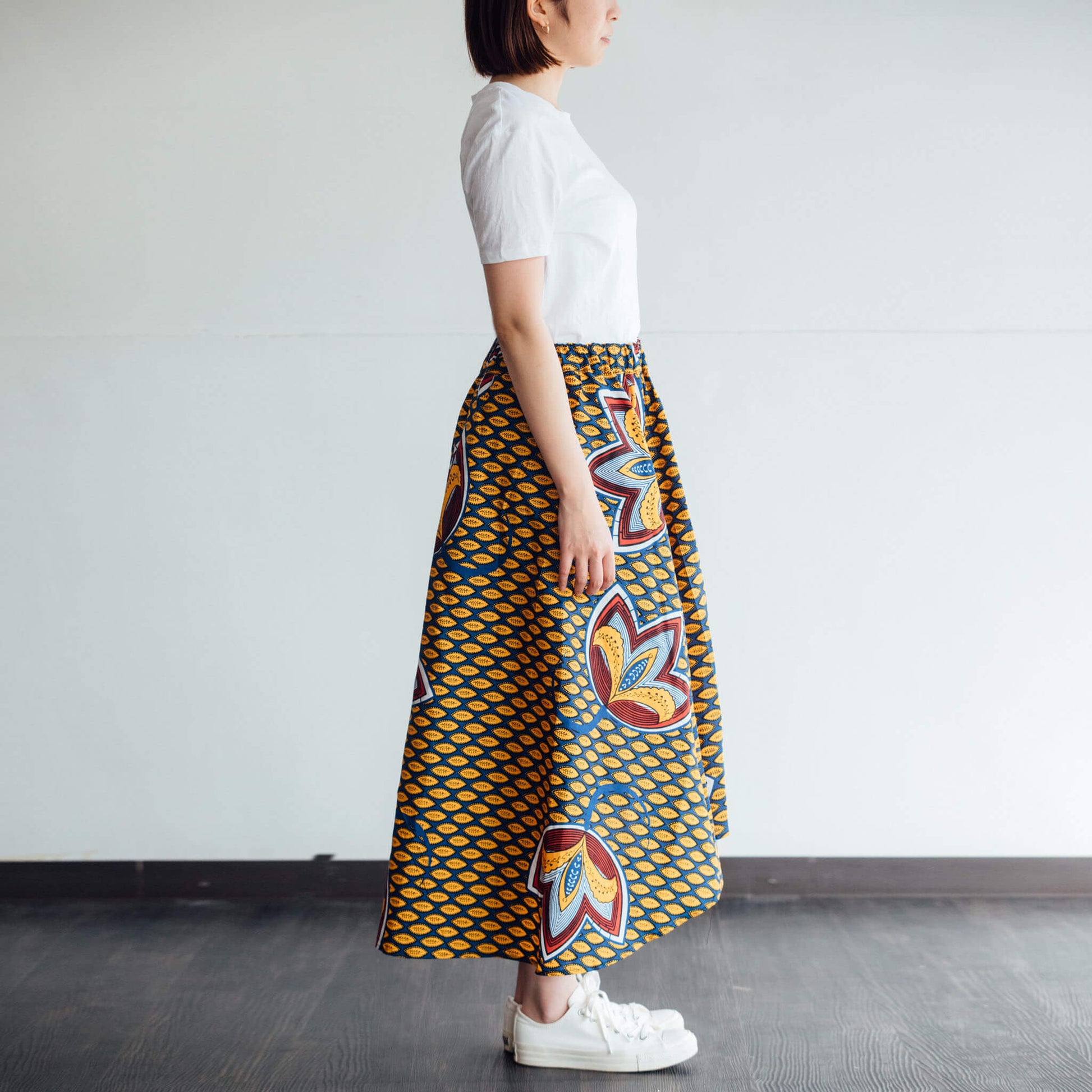 後ろに向かって丈が長くなる前後アシンメトリーなデザインのスカートです。